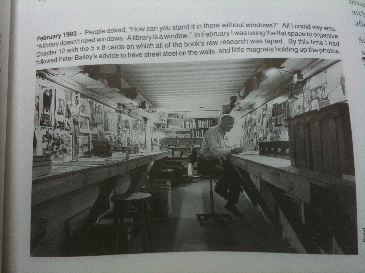 He is thinking inside the box. This is a man taking his creative work seriously. Everything about this space conveys the message: this project matters. It is a space for him to think with, to help him organize his thinking, and to connect him emotionally to his project. It is adaptable, and able to evolve in response to what he is doing; but at the same time also organized, likely reflecting and supporting the organization of the book. I've often talked this image over with other creative researchers, many of whom find it inspiring.